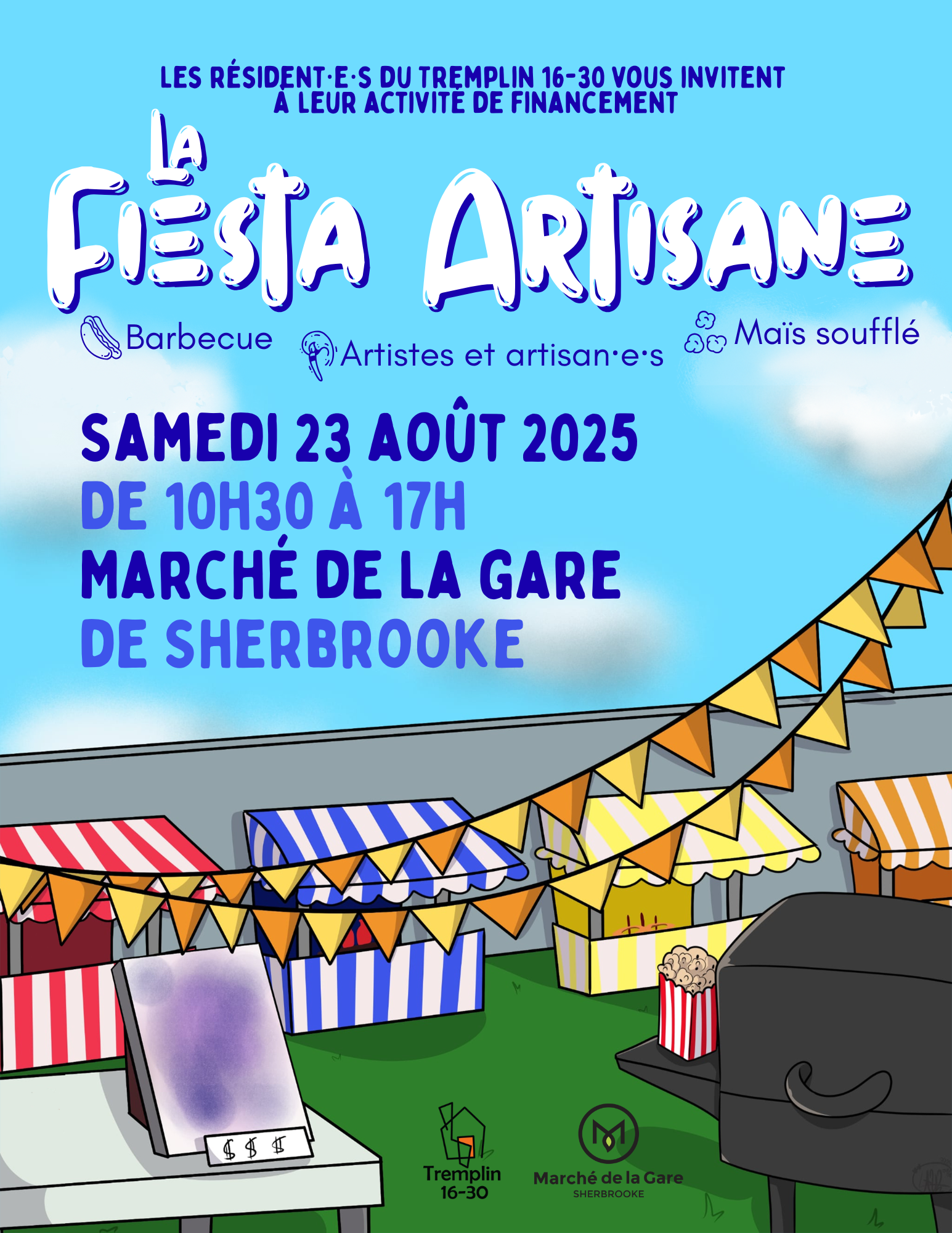 Les résident·e·s du Tremplin vous invitent à une toute première Fiesta artisane au Marché de la Gare de Sherbrooke, le samedi 23 août, de 10h30 à 17h. Venez découvrir les créations originales d’artistes locaux ainsi que des jeunes du Tremplin! Peintures, illustrations, créations au crochet, vêtements, sérigraphies, cartes, autocollants... la créativité sera définitivement à l’honneur! Des hot-dogs, du maïs soufflé et de la limonade seront aussi offerts en échange d’une contribution volontaire.